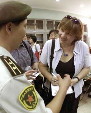A People's Liberation Army officer is answering a question from an unspecified journalist. 105 Beijing-based foreign journalists from 10 countries visited China's army and air force bases in Tianjin on July 10, 2002. It is the first time in the country's history that military forces have received so many foreign journalists. [Xinhua]
