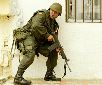 Colombian police reacts during a raid searching urban rebels of the FARC in Medellin, October 17, 2002. The offensive left at least 10 people dead and 18 wounded, the latest casualties in the country's 38-year-old war. FARC and ELN rebels are waging a bloody battle against anti-guerrilla militias in Medellin's slums, where thousands of peasants fleeing violence have settled.[Reuters]