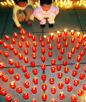 | | | | | | | | | | | | |  | | | Wang Guoping, Party Secretary of Hangzhou Municipal Government, presents a medical aid certificate to a disabled person at the unveiling ceremony of Hangzhou Huimin Hospital,the first charity hospital in Hangzhou, capital of East China's Zhejiang Province, and the largest in the country, on Saturday, September 27, 2003. | | | | | | | | | | | | |  | | | Colorful street lamps light the South Yan'an Road of Hangzhou, capital city of East China's Zhejiang Province, Thursday night, September 25,2003. [Hangzhou Daily] | | | | | | | | | | | | |  | | | A child places a candle on the ground while another looks on near West Lake in Hangzhou, the capital of East China's Zhejiang Province. Local residents lit up more than 1,000 candles Sunday, praying for the country's success in its clash against the deadly SARS disease. Over 100 expatriates in the city also took part in the event.[newsphoto.com.cn]