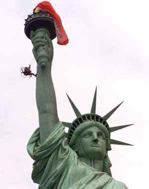 French adventurer Thierry Devaux, a veteran bungee jumper known for leaping from some of the world's most famous landmarks, was released on bail in New York on Thursday after a bungled attempt to land on the Statue of Liberty. He had dangled off the Statue's famous torch for nearly an hour before being arrested by police. Judge Ronald Ellis accused Devaux of "trespassing on property not open to the public without official authorization, intent to cause public alarm (and) putting himself and other at risk that tried to rescue him." His sentence is to be decided at a hearing on September 24. The charges carry a sentence of up to three months in prison. Devaux, whose passport was taken away, has until Monday to produce 2,000 dollars in bail money. At about 9:30 am (1330 GMT), Devaux, also known as Terry Do, took off from the nearby New Jersey coast using a motorized parasail and attempted to land on the platform surrounding the gilded torch of the Statue of Liberty. But he failed to land on the tiny platform, according to witnesses, and instead stood dangling in mid-air, several meters below his target, when the cloth of his parasail snagged on the flame. Several days before Thursday's stunt, Devaux told reporters that he planned to land on one of New York's most emblematic structures -- whose identity he would not reveal -- and then bungee jump from it. After being suspended for 45 minutes below the torch, supported by the cords of his parasail, Devaux managed to climb onto the platform, where he was arrested by police. Far from achieving the freedom he hoped to attain with his bungee jump, Devaux instead left Liberty Island in New York Harbor in handcuffs, escorted by two members of the New York Police Department. Devaux boasts successful bungee jumps from Paris's Eiffel Tower and San Francisco's Golden Gate Bridge. |